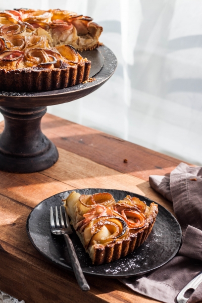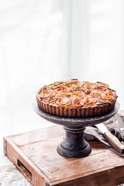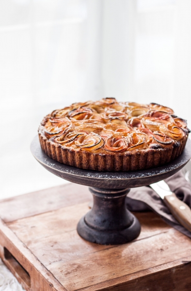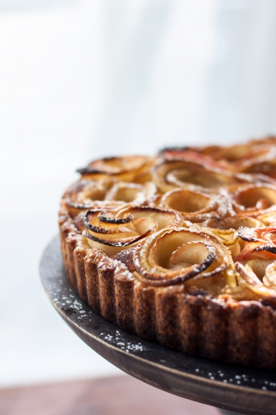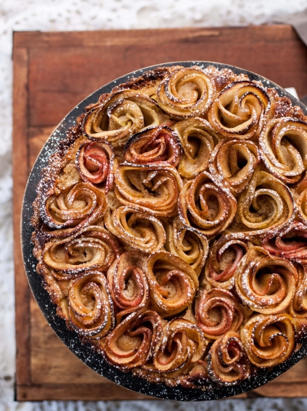 Roll apple slices into roses, place roses on top of frangipane layer.