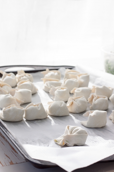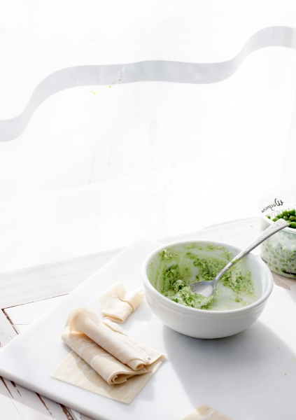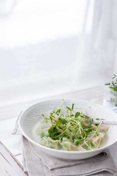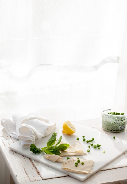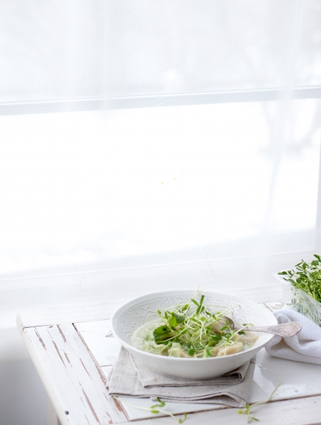 In a food processor mix ricotta, cooked green peas, lemon zest, lemon juice, salt, pepper, grated parmesan. Use store-bought wonton wrappers or homemade dough circles to make tortellini. Boil toertellini in home made vegetable or chicken broth. Serve right away, with fresh pea shots, added cooked peas, mint leaves, and chicken pieces.