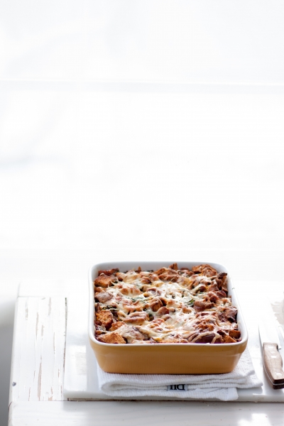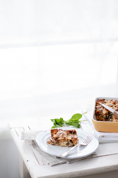 Toast cubed white bread in 350oF oven until lightly tosted. Remove from oven, transfer to large bowl. Add whatever you want to use for strata: cooked leftover sausage, chicken, ham, and/or sauteed kale, spinach, onions, mushrooms, sweet peppers, brocolli, herbs, etc. In another bowl mix eggs, cream, salt, pepper, and a pinch of nutmeg. Pour over bread. Add shredded cheese (gruyerre, cheddar, Swiss, or a mixture of all three). Transfer everything to buttered baking dish, cover with plastic wrap, press slightly, refrigerate overnight. Remove strata from refrigerator, sprinkle more cheese on top. Bake at 350oF until puffed and lightly browned. Serve right away.