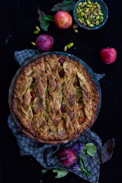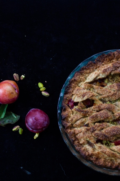 In a food processor pulse pistachios until finely ground; add flour, salt and sugar, mix until incorporated. Add butter, and pulse until mixture resembles coarse crumbs. Add iced water, one tablespoon at a time, and pulse until the dough just comes together. Turn out the dough mixture onto a clean work surface lined with plastic wrap. Divide dough in half and shape each half into a flattened disk. Wrap in plastic, and refrigerate for at least one hour or overnight.