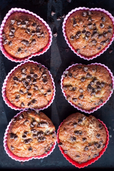 Paruoštą tešlą paskirstyti į paruoštas keksiukų formeles, pripildant maždaug ¾ formelių tūrio. Pašauti į įkaitintą orkaitę. Kepti maždaug 20-30 minučių, priklausomai nuo keksiukų dydžio. Traukti iš orkaitės. Palikti, kad šiek tiek atvėstų. Tiekti šiltus.