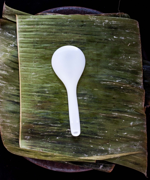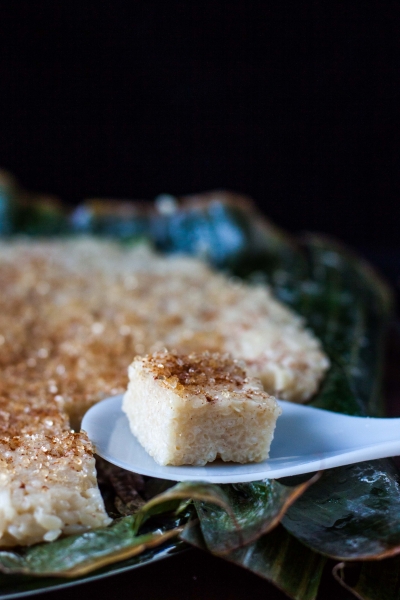 Išvynioti bananų lapus, atkirpti du didokos lėkštės dydžio lakštus. Bananų lapų lakštus lengvai apskrudinti virš ugnies, maždaug porą sekundžių, kol lapai pakvips ir taps matiniai. Vieną bananų lapo lakštą patiesti ant lėkštės, ant jo iškrėsti ryžius, išlyginti į lygų sluoksnį, užbarstyti turbinado cukrumi ir cinamonu, užkloti antru bananų lapo lakštu. Padėti kad pilnai atvėstų. Pjaustyti norimo dydžio kvadratėliais ir nešti į stalą.