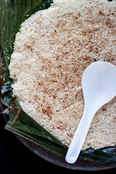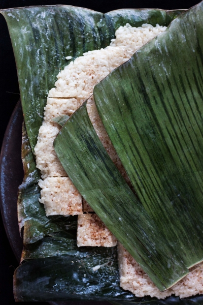 Line a plate or a platter with one piece of toasted banana leaf. Spread rice mixture on a leaf in an even layer, sprinkle with turbinado sugar and cinnamon. Cover with second piece of banaa leaf. Let cool completely. Cut into portions and serve.