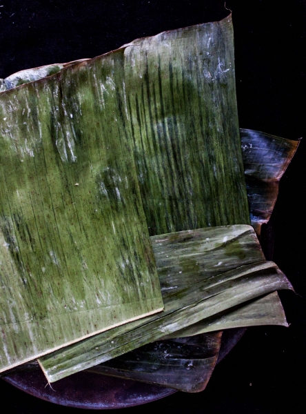 Unwrap banana leaf, cut the pieces that a slightly larger than a plate or a platter. Toast banana leaves over electric or gas burner for a few seconds, until leaves turn opaque and become fragrant.