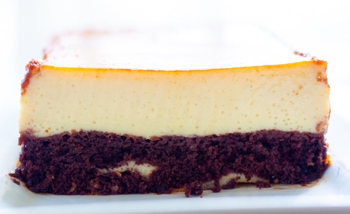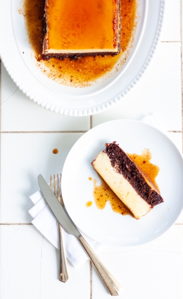 Labai mandras ir įdomus kepinys. Chocoflan. Du nesimaišantys sluoksniai: kiaušininis-vanilinis ir kakavinis-šokoladinis. Įdomiausia, mano manymu, yra tai, kad šie du sluoksniai kepimo metu apsikeičia vietomis, rudas kakavinis sluoksnis iškyla į viršų, kiaušininis nusėda į dugną. Be to, dar yra geraskiekis saldžios karamelės. Kai pamačiau receptą naujajame Bon Appetit numeryje, iškart užsimaniau tuojau pat išbandyti.