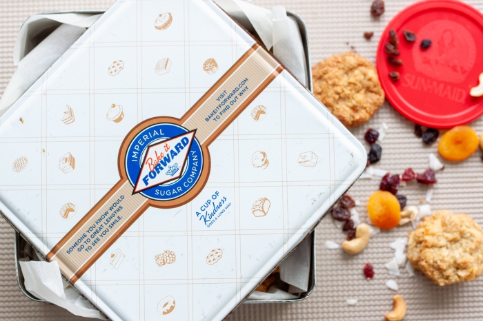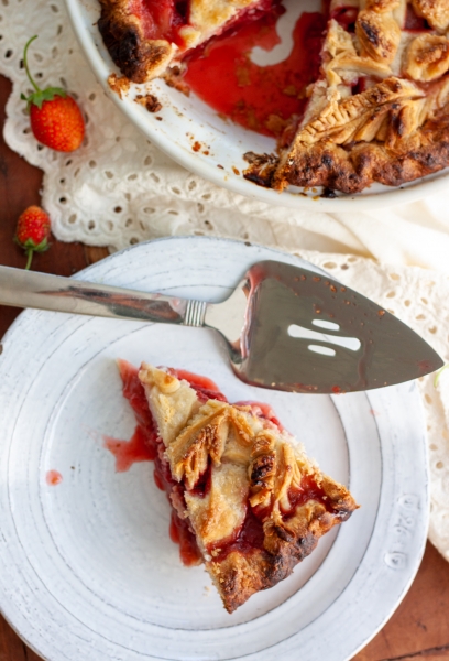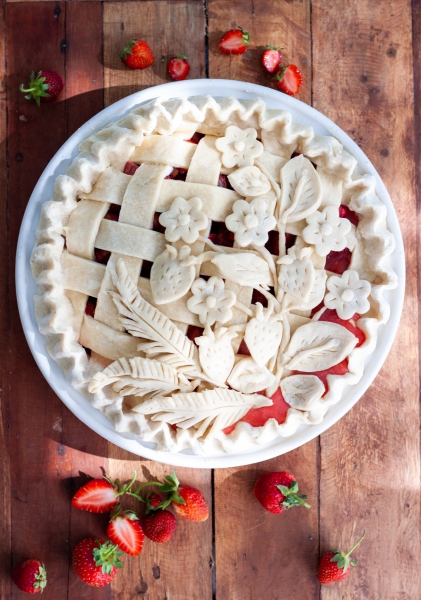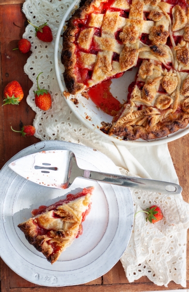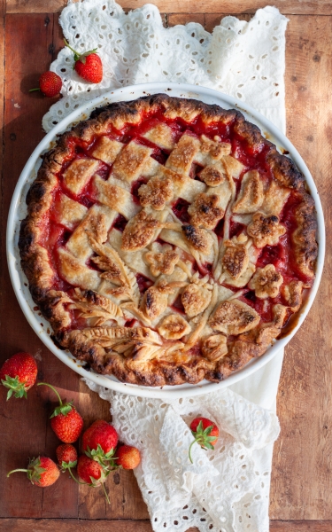 Iš šaldiklio išimti skardą su tešlos juostelėmis. Juosteles išdėlioti ant įdaro, jas supinant į retą tinklelį. Nupjaustyti per kraštus išlindusius tešlos galus. Pyrago viršų patepti pienu ir pabarstyti cukrumi. Pašauti įįkaitintą orkaitę. Kepti 20 minučių 220oC. Orkaitės temperatūrą sumažinti iki 190oC ir dar kepti 40-45 minutes, kol pyrago viršus paruduos, o įdaras pradės burbuliuoti. Pyragą traukti iš orkaitės, dėti ant grotelių, kad atvėstų. Tiekti šiltą arba kambario temperatūros, su plakta grietinėle arba vaniliniais ledais.