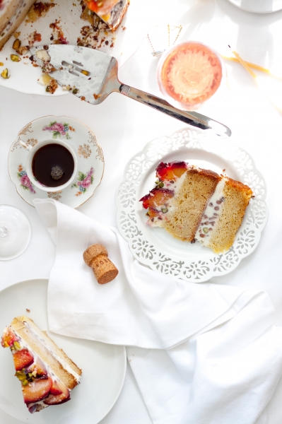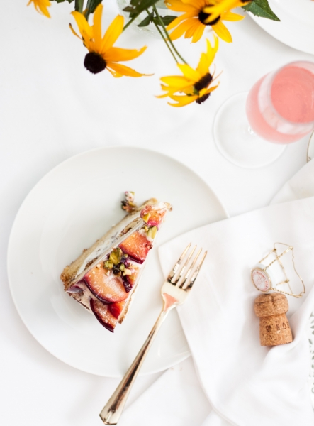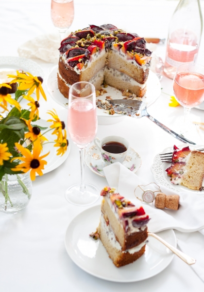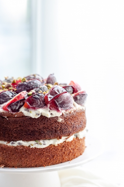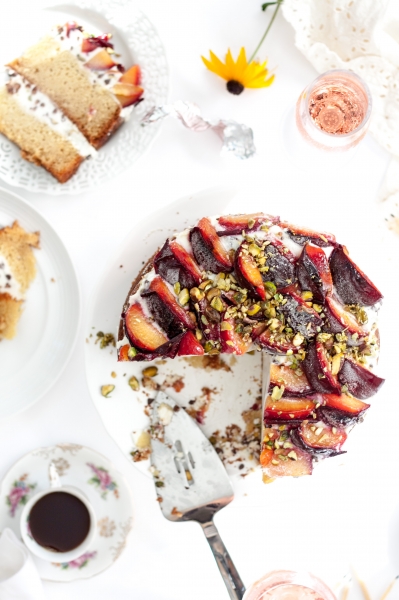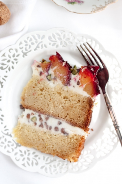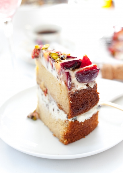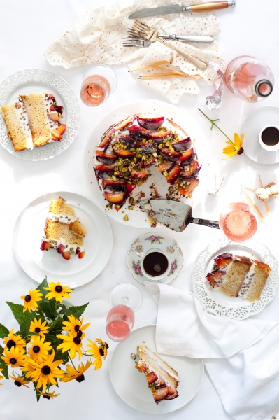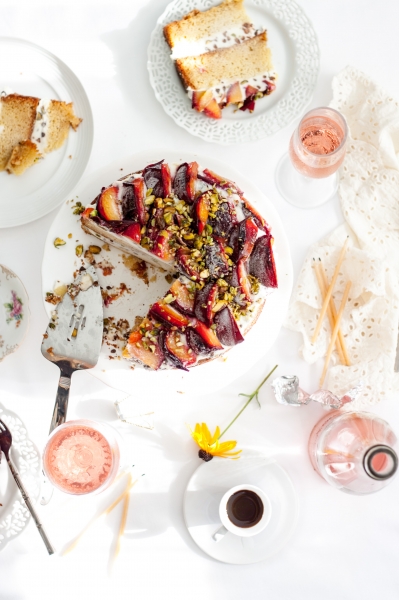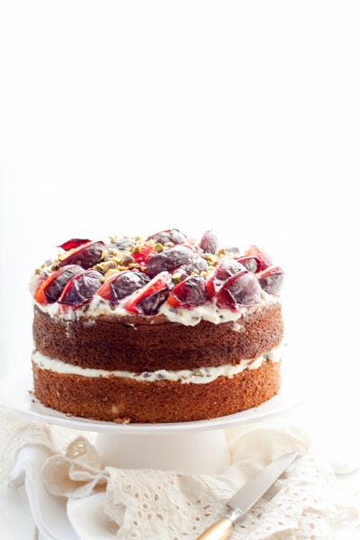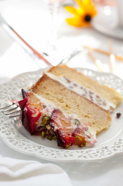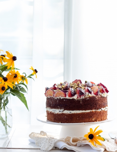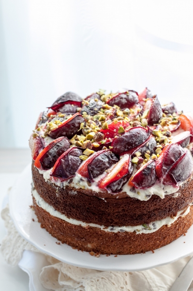 Place one cake onto a cake stand or a plate. Using serrated knife, even the top. Spread half of ricotta filling in an even layer. Top with another cake. Even the top. Spread remaining filling. Top with roasted plums. Sprinkle with chopped pistachios.