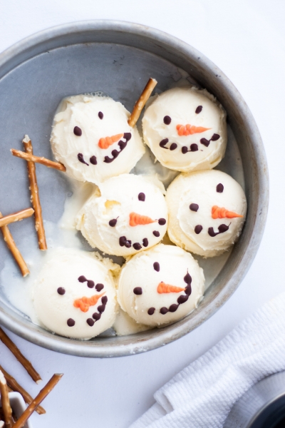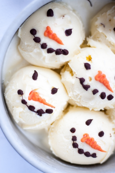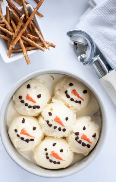 Scoop out ice cream into balls onto a cookie sheet or plate. Freeze until firm, at least 30 minutes. Pipe on snowmen faces: two eyes, dotted smile and a carrot nose. Place ice cream balls back in the freezer; freeze until firm, preferably overnight.