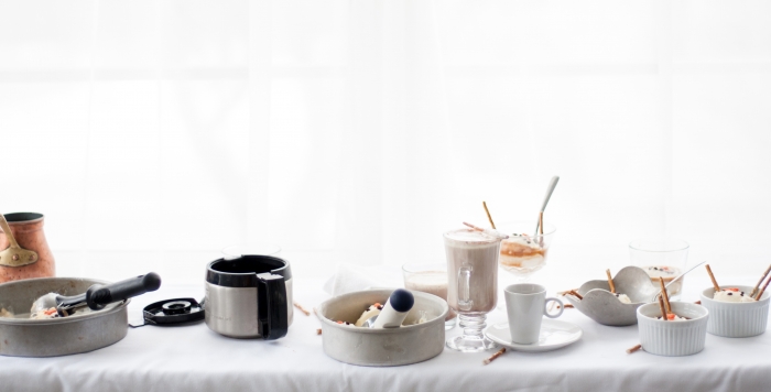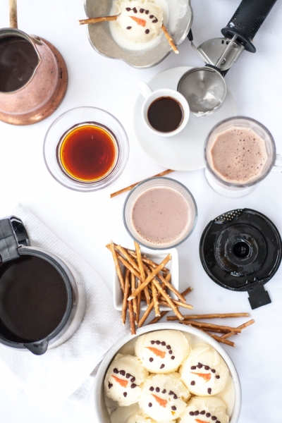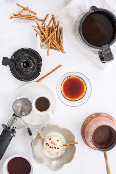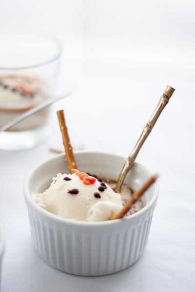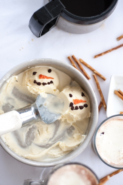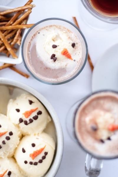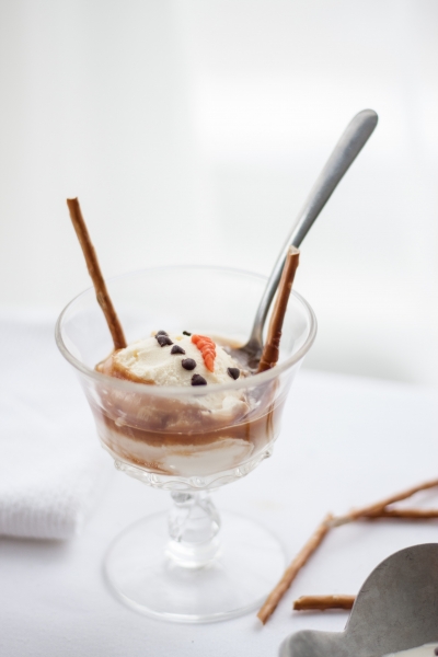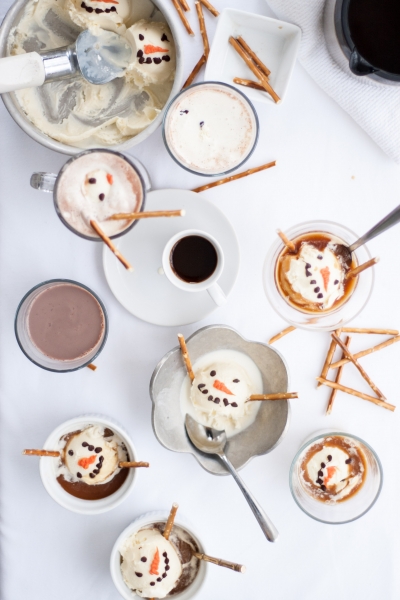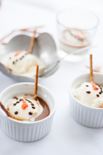 When you’re ready to serve affogato, pour hot coffee or hot chocolate into mugs or ice cream bowls, top with snowmen ice cream, decorate with pretzel sticks. Serve right away, with a straw or a spoon.