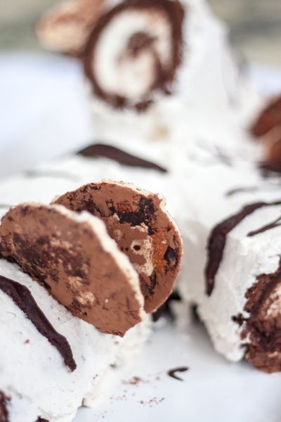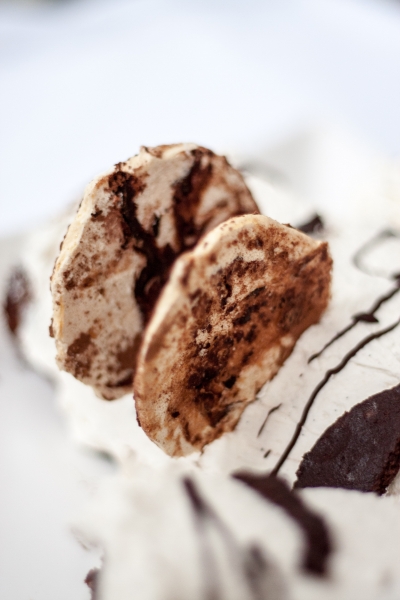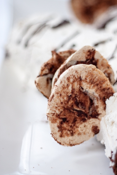 Ant sauso lygaus paviršiaus išvynioti susuktą biskvitą. Biskvito paviršių suvilgyti kakavos sirupu. Užtepti šokoladinio kremo sluoksnį, išlyginti paviršių. Ant šokoladinio kremo užtepti lygų maskarponės kremo sluoksnį. Prilaikant už rankšluostėlio, susukti vyniotinį ir padėti šaltai, kad kremas sustingtų.