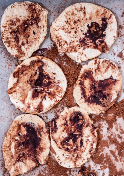 Lightly dust meringue with more cocoa powder and place a sheet of parchment over top. Flatten meringue into irregularly shaped disks about ⅛ inch thick. Bake until lightly browned and parchment peels away easily, 75–90 minutes.