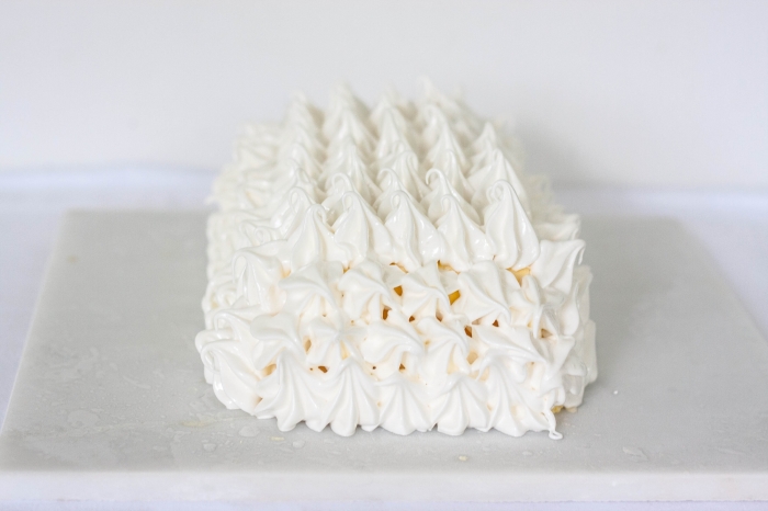 Using a pastry bag fitted with a large star tip, o using a spatula, cover the entire surface of ice cream with meringue.