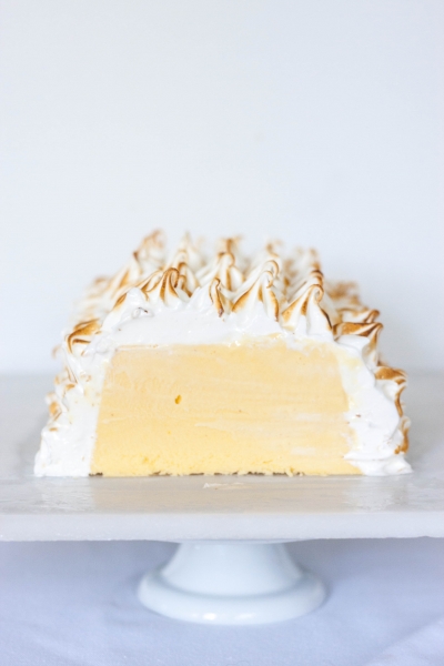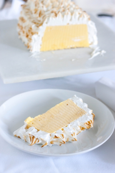 Prior to unmolding, dip the loaf pan with ice cream into a pan with hot water for a few seconds. Unmold onto the frozen platter. Place back into freezer while you make the meringue.