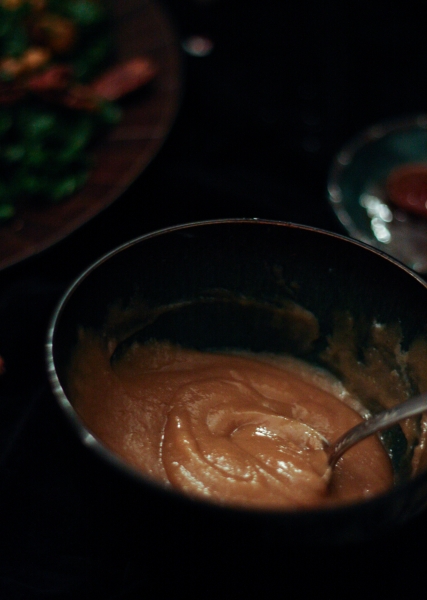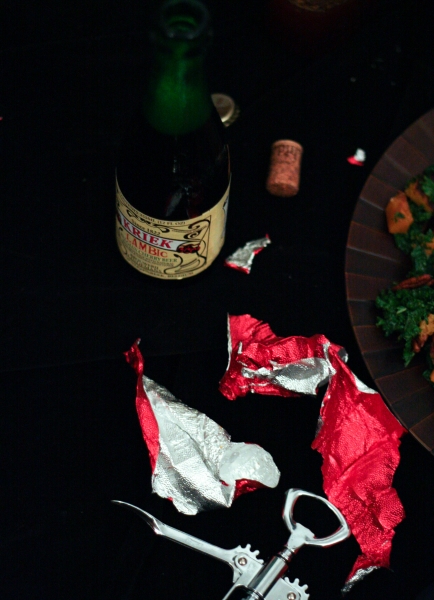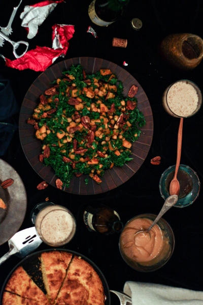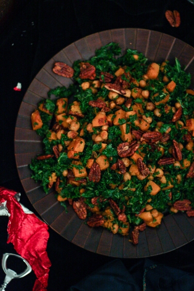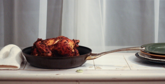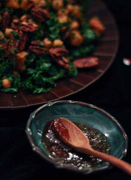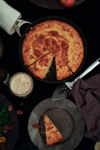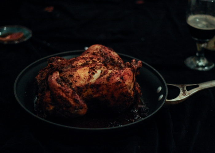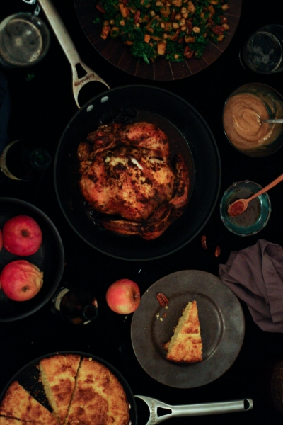 Tai va, o sugrįžus reikėjo gi šeimai pagaminti kažką pavalgyti. Nes šaldytuvas man sugrįžus buvo kaip iššluotas, o nusiteikusių kažkaip tą klausimą spręsti niekur nesimatė. Tai aš sekmadienį iš pat ryto, po kelionės bluosto taip ir nesudėjusi (nes namo sugrįžau 4:00 am), kulniavau į gastronomą, parvilkau produktus ir paruošiau šeimai vakarienę: keptą vištą, faux-tisserie stiliumi, lapinių kopūstų salotas su keptais moliūgais ir greitą kukurūzų miltų duonelę. Kol visa tai kepė ir gaminosi, saulė ėmė ir nusileido, nes dienos, kaip žinia, vis dar baisiai trumpos. Na o kadangi pagaminus tokią puikią vakarienę man ją norėjosi trūks-plyš įamžinti savo mylimąjame bloge, tai aš viską fotkinau prie kapitaliai pavėpusio apšvietimo, ir būtent todėl tos žemiau sudėtos nuotraukos yra tokios, kokios yra. Šitaip, brangieji, atrodo blogo įrašai, kai blogeriai visiškai neturi laiko, nes laiką leidžia protestuodami už visų moterų ir mergaičių teises. Ir už jūsų teises taip pat, ponia Sigita.