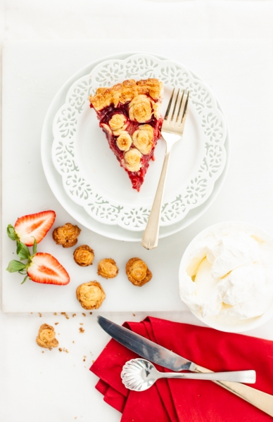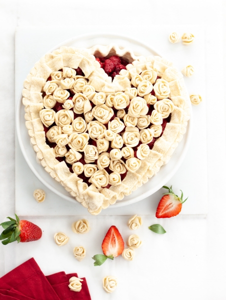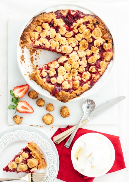 Mix together strawberries, raspberries, sugar, cornstarch, flour, zest and juice of lemon, cinnamon, nutmeg, salt, and vanilla. Mix well in a large bowl.