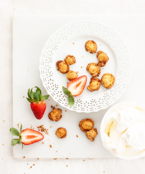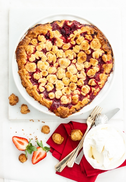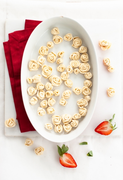 Take out second disk of chilled dough from refrigerator. Roll it into 1/4” thick round. Cut the dough into ½” wide strips (Optional: shape the strips into miniature roses); Place strips onto parchment-lined baking sheet; place the baking sheet in the freezer.