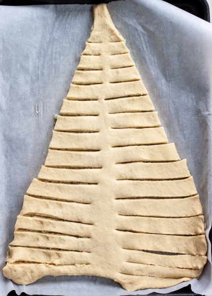 Ant iškočiotos tešlos užtepti pusę sviesto mišinio. Iškočioti antrą dalį tešlos, užkloti ant pirmos iškočiotos dalies. Iš tešlos išpjauti eglės formos trikampį. Užtepti likusį sviesto mišinį, susukti eglės šakas. Skardą pašauti į įkaitintą 200oC orkaitę, kepti kol kepaliuko viršus gražiai paruduos, maždaug 25 - 30 minučių.