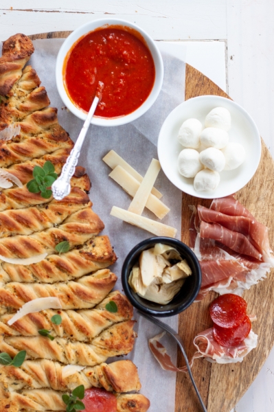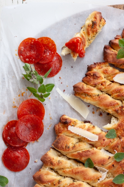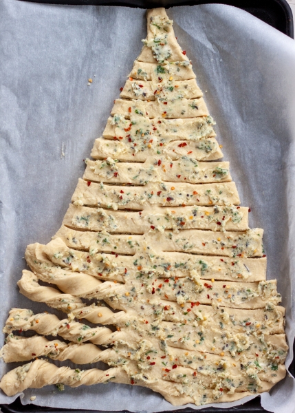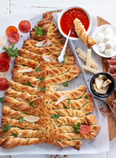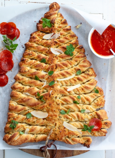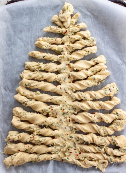 Line the baking sheet with parchment. Divide dough in half. On a floured surface, roll each dough into a large rectangle. Spread half of butter mixture on top of rolled dough. Roll out the remaining piece of dough, place on top of the buttered dough, cut into the shape of a tree. Spread the remaining butter mixture on the dough, twist the branches. Bake at 400oF until golden brown, approximately 25-30 minutes. Serve with warm marinara sauce.