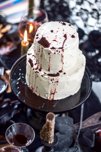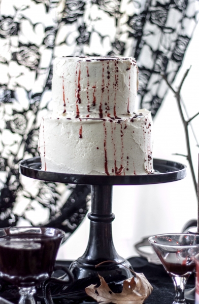 Place one cake layer on a serving platter. Spread about 1 ¼ cups of frosting on top. Place the next layer on top, frost and add the third layer. Spread a thin layer of frosting on the top and sides of the cake. Refrigerate for 30 minutes or freeze for 15 minutes. Frost the sides and the top with remaining frosting. Refrigerate until ready to serve. Bring to room temperature before serving. Right before serving splatter some fake blood all over the cake.
