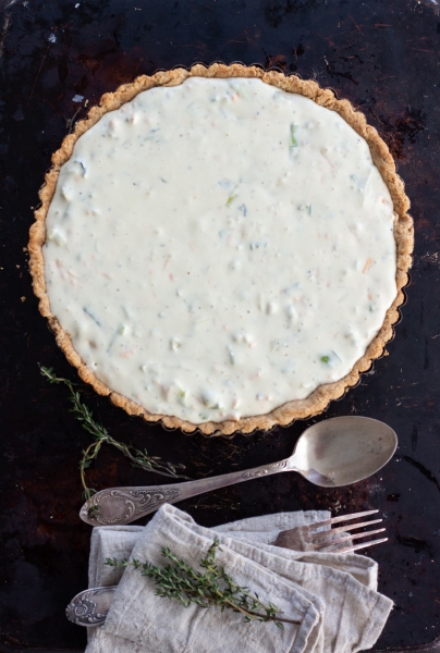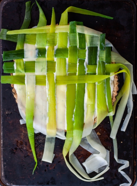 Reduce oven temperature to 300 oF. Spread filling onto prebaked crust. Arrange blanched leeks in a lattice pattern. Sprinkle with thyme, salt and pepper. Bake for 45-60 minutes, until filling is set.