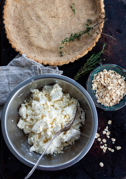 Transfer chilled dough into buttered tart pan, press into even layer. Cover dough with parchment, fill pan with dry beans, bake at 350 oF for 15 minutes. Remove beans and parchment, return crust to oven, bake for another 10 minutes. Remove from oven, let cool.