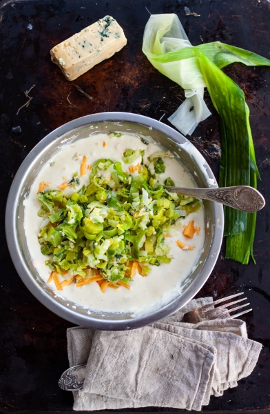 Dubenėlyje išsukti grietinėlės sūrį ir rikotą, Po vieną įmaišyti kiaušinius, suberti tarkuotą čederį ir stiltoną. Sudėti keptus porus. Išmaišyti.