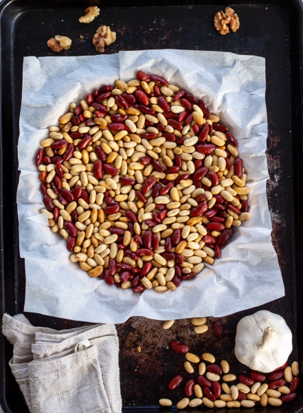 Tešlą išversti į sviestu išteptą formą, suspausti į lygų sluoksnį. Ant tešlos užtiesti sviestinio popieriaus lakštą, į formą priberti sausų pupelių, pašauti į karštą orkaitę, kepti 15 minučių. Traukti iš orkaitės, nuimti popierių ir pupeles, kepti dar 10 minučių. Traukti iš orkaitės, palikti kad atvėstų.