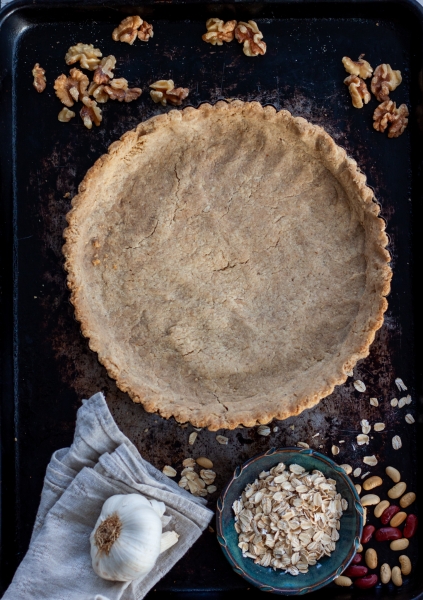 In a food processor pulse walnuts, oats, flour, salt and sugar until finely ground. Cut butter into small pieces, add to flour mixture, pulse until incorporated. Add egg and mix until dough forms. Chill.