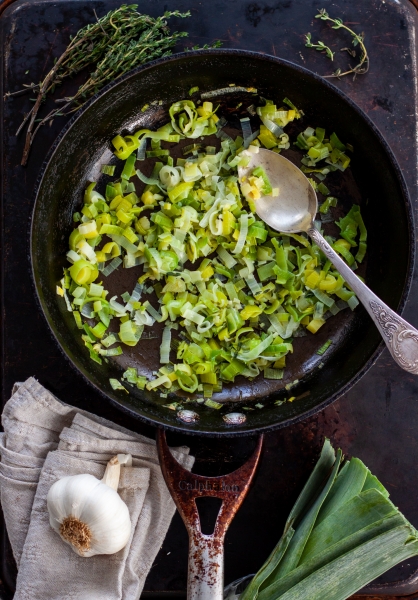 Mažoje keptuvėje pakepinti susmulkintą porą, susmulkintą česnaką ir čiobrelius, su trupučiu sviesto. Kepti kol porai suminkštės. Nukelti nuo ugnies, palikti, kad atvėstų.