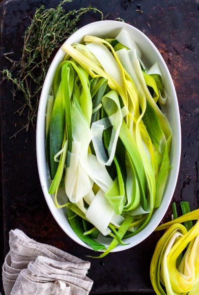 Cut leeks in half, wash, pull apart into strips.