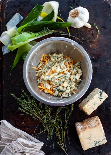 Whip ricotta and cream cheese, until smooth. Add eggs, grated cheddars and stilton. Mix in sauteed leeks.