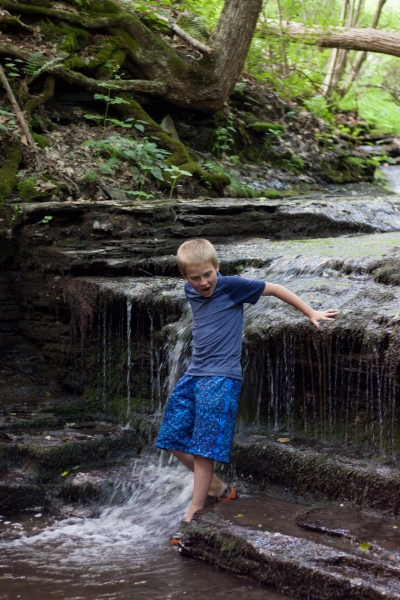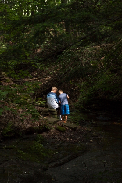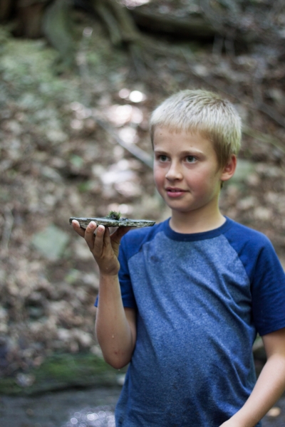 O miške, kaip nebūtų keista, visi niurzgėjimai pasibaigė. Po medžiais buvo vėsu ir gera, jokių uodų, šaltas upelis čiurleno. Julius iškart įsibrido į vandenį, ėmė vartyti akmenis ir ieškoti salamandrų. Jonas irgi visai gerai jautėsi. Aš gana sparčiai viską nufotkinau, nes apšvietimas pasitaikė itin geras. Po kokio pusvalandžio jau buvau besiruošianti keliauti namo, bet vaikai namo eiti nenorėjo, ir pasilikom mes miške dar gerą valandą. Tai štai pamoka ateičiai: reikia juos tempti iš namų, nori ar nenori, nekreipiant dėmesio į jokius protestavimus, nes kartais tie mano vaikai net patys nežino, kaip gali būti gera ir smagu miške, gamtoje, be elektronikos, be telefonų, be distancinių pultelių ir be viso kito.