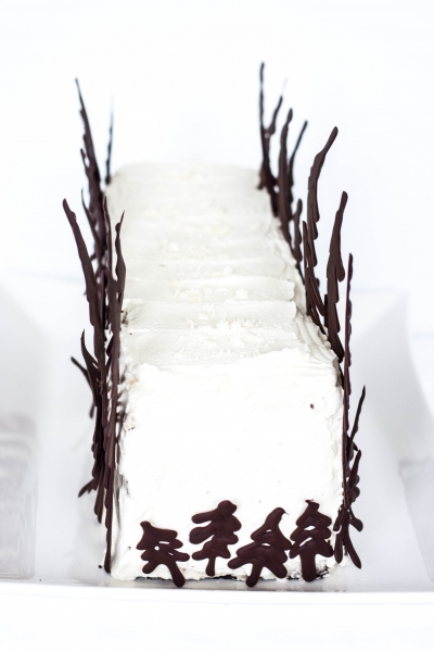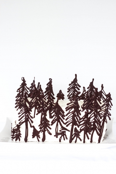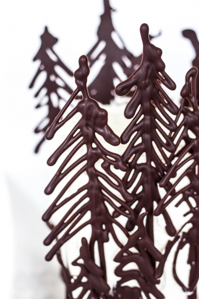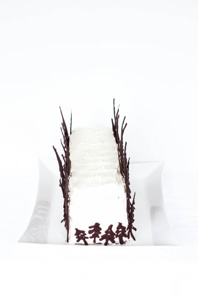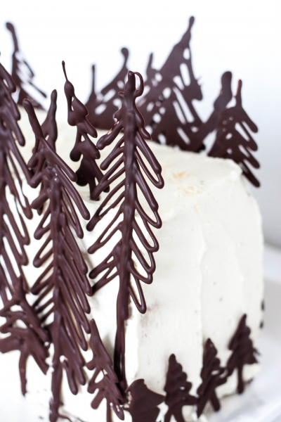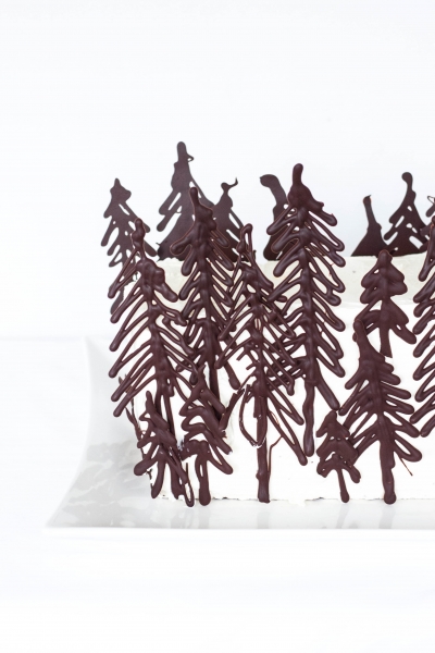 4. Frost the outside of the cake with the remaining cream. Decorate with chocolate shavings, chocolate trees, fresh cherries, or a dusting of powdered sugar/cocoa powder, if desired.