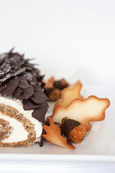 Reserve 1 ½ cups mascarpone filling. Unroll cake and spread remaining filling on top, leaving a ½-inch border on all sides. Carefully reroll cake (without towel). Arrange, seam-side down, on a plate or a platter. Using a serrated knife, trim end of log. Spread reserved filling over log. Working quickly, arrange chocolate bark all over log, overlapping pieces slightly. Refrigerate until firm, at least 1 hour. Garnish with acorns and leaves, if desired; dust with confectioners' sugar before serving.