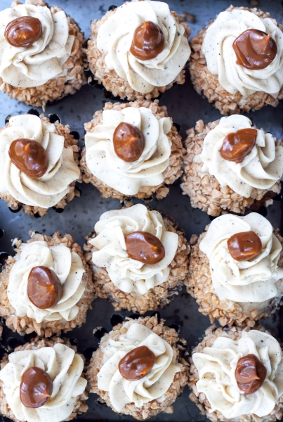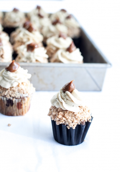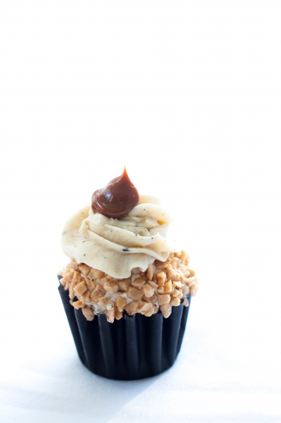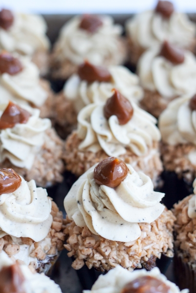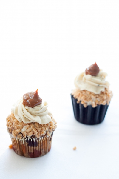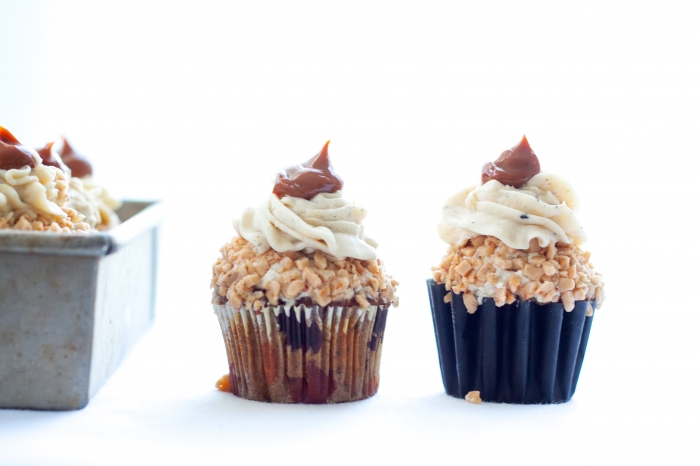 Frost cooled cupcakes with frosting. Garnish with crushed toffee bits. Drizzle with dulce de leche or caramel sauce.