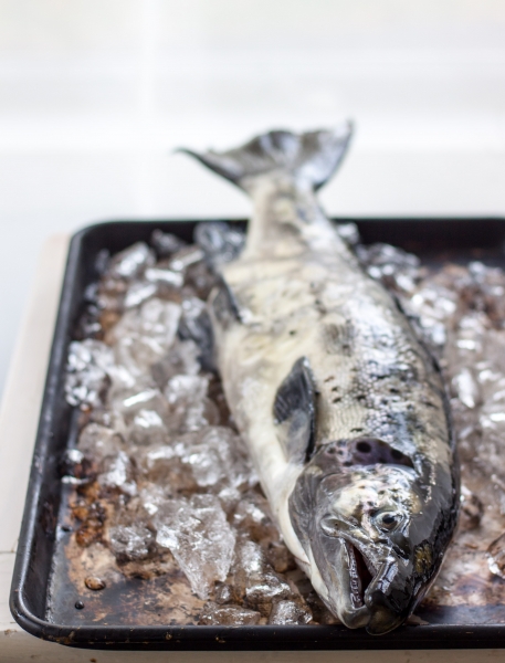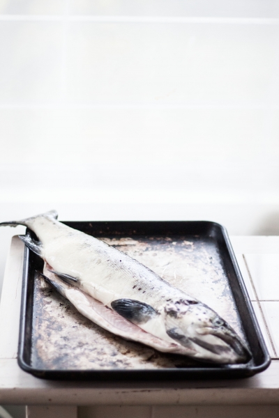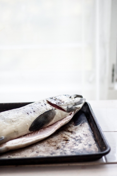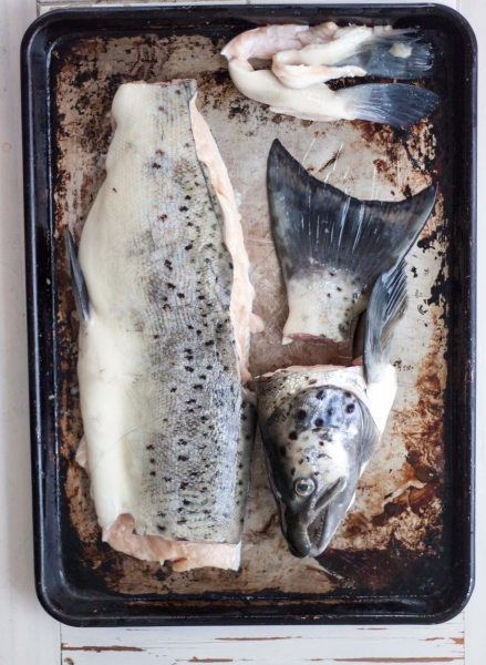 Kadangi šviežiai sugautos lašišos sūdyti nebegalėjau, tai reikėjo sugalvoti kažką kito. Keli kilogramai šviežios žuvies, kurią reikia kuo greičiau pagaminti, kad toks grožis nesugestų. Galvojau virti žuvienę, bet mano šeima tokio patiekalo nenori valgyti; galvojau kepti visą, su galva, uodega it kt., prikimšti šviežiu imbieru, svogūniukais ir kalendrų lapeliais, sulaistyti sojų padažu ir sezamų aliejumi, kinišku stiliumi. Bet žuvis tokiam patiekalui buvo per didelė. Nei į vieną mano turimą skardą visa žuvis, su galva ir uodega, netilpo. Teko pjaustyti.