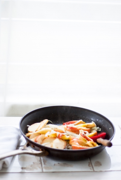 Wash, core and slice both apple and onion. Melt remaining butter in a large skillet, add onion and apple slices and cook over medium heat, stirring occasionally, for 6-7 minutes, until slightly softened but still crunchy. Remove from heat and cool.