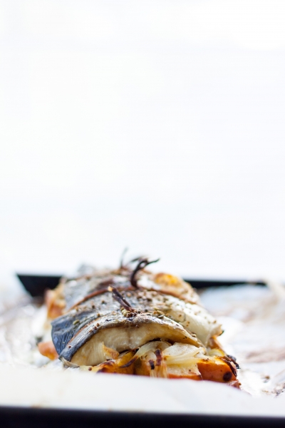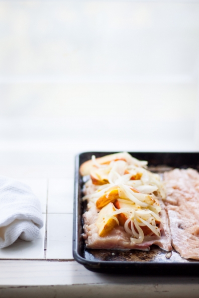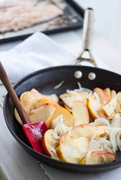 Paskui prisiminiau prieš porą metų gamintą patiekalą su obuoliais ir pankoliais, nusižiūrėtą iš Simple Bites blogo. Prie to recepto dar buvo labai lyriška istorija apie lašišų žvejybą, rudenį, nerštą, apie sugrįžimą namo, apie gimtinę ir visa kita. Tas patiekalas man iškart užstrigo, nes toks sezoninins ir visaip kitaip teminis. Pankolių neturėjau, bet turėjau saldųjį svogūną, tai jį ir sudėjau vietoje pankolio. Svogūnas čia tiko kuo puikiausiai. Obuoliai ir obuolinis padažas suanuliavo bet kokį žuvinį skonį, kurio taip baisiai nemėgsta mano vaikai. Lašišos kepsnys gavosi toks švelnus, saldokas, ir visi prieskoniai: garstyčių grūdeliai ir pankolių sėklos čia tiko kaip muzika.