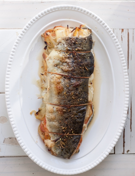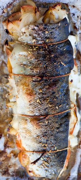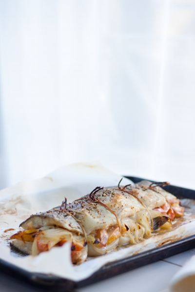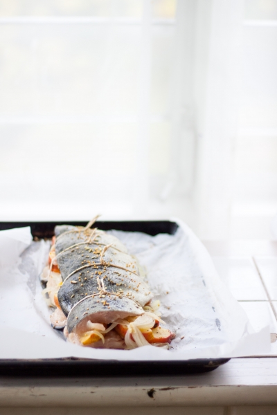 Apple & Onion Stuffed Salmon with Cider Sauce
