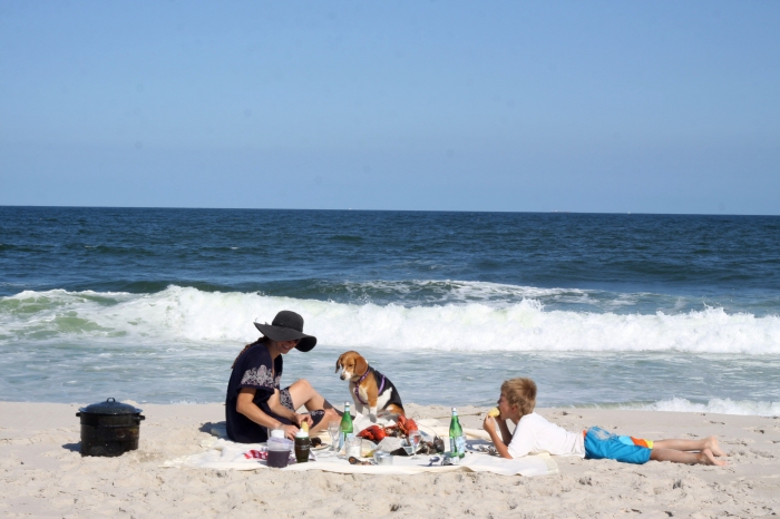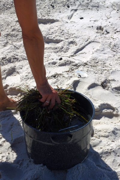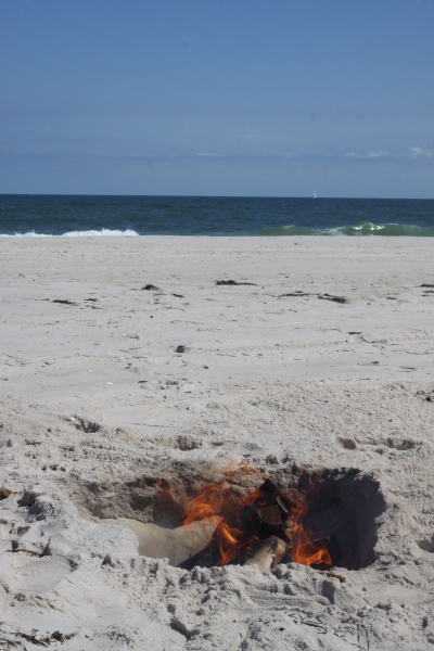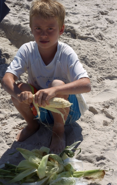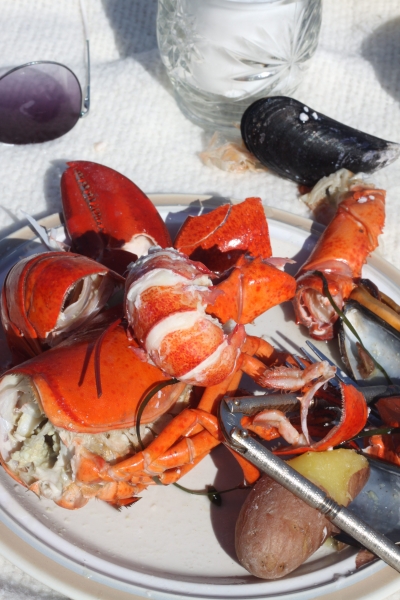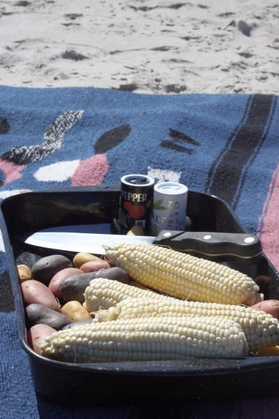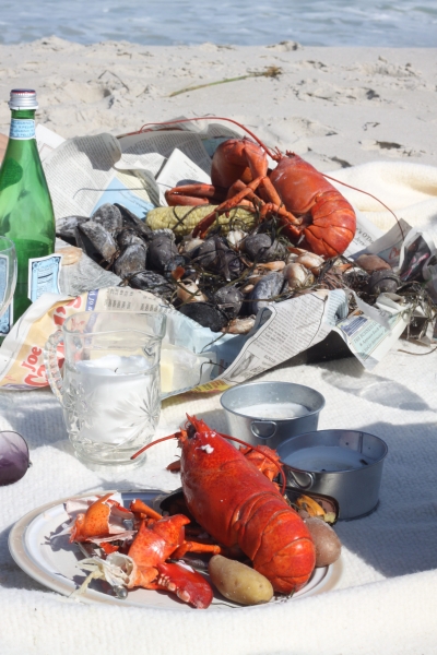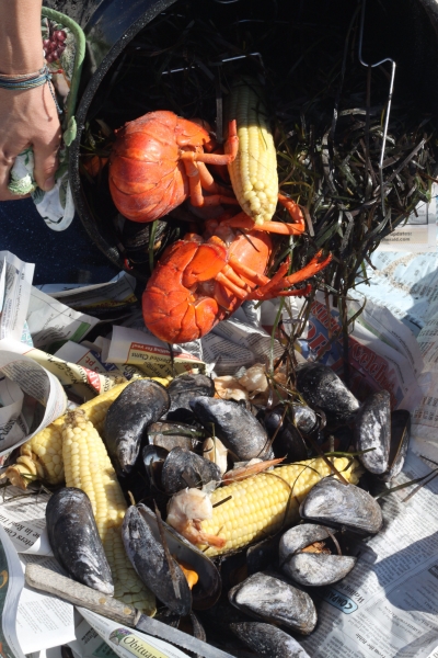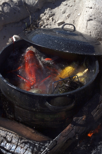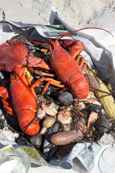 Dig a pit in a sand and set a strong burning fire. Fill large pot with ocean water. Let the sand settle on the bottom. Cover the bottom of the pot with thick layer of seaweed. Place potatoes and corn in the pot. Set the pot directly onto the flames, add more firewood if needed, to maximize the heat. Bring water to boil. Cook covered for 10 minutes. Add live lobsters, cook for 10 minutes. Add mussels, clams and shrimp, cook for 5-8 minutes, until mussels and clams are open and shrimp are cooked through.