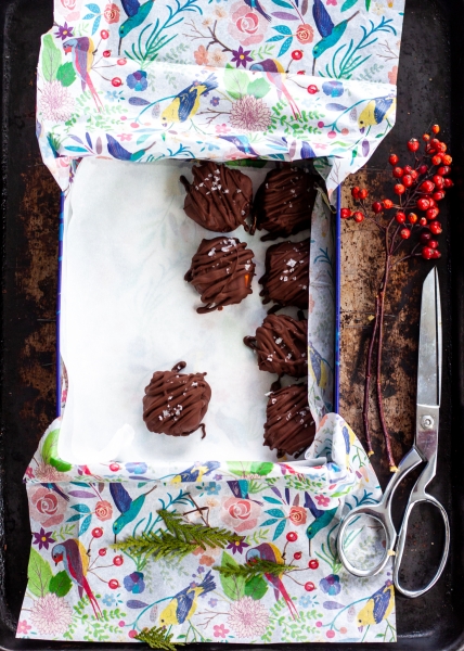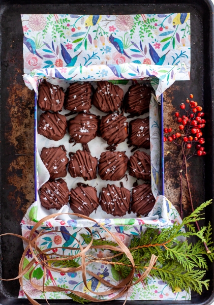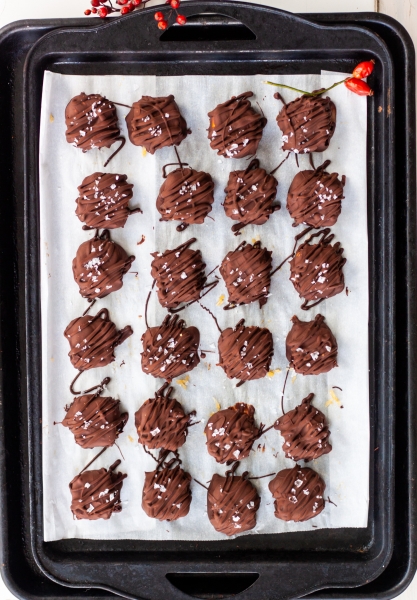 Susmulkintą šokoladą ištirpinti virš garų. Sausainius traukti iš šaldiklio, po vieną pilnai panardinti į šokoladą, dėti ant sviestiniu popieriumi ištiestos skardos. Užbarstyti jūros druskos. Skardą su saldainiais dėti į šaldiklį, kad sukietėtų.
