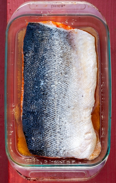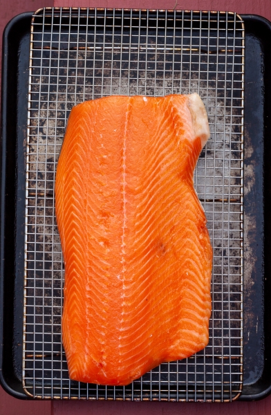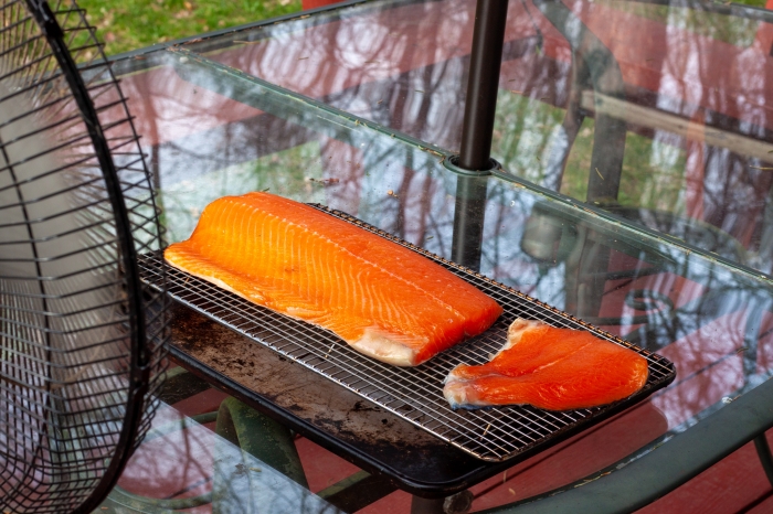 Remove fish from the brine, rinse briefly, dry with paper towels. Place fish, skin down, on a cooling rack placed on top of baking sheet. Dry fish, uncovered, until dry to the touch, about 4 hours.