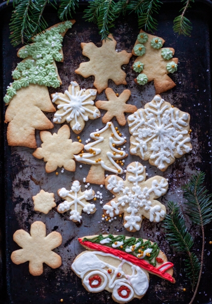 Kalėdinių sausainių kepimas ypatingas tuo, kad pats kepimo ir dekoravimo procesas yra nei kiek ne mažiau smagus ir malonus, nei galutinis kepinys. Kartą metuose tokia proga pasitaiko, taip kad aš, pasimėgaudama, prikepiau visą tuntą sausainių, mažų ir didelių, saldžių, mėtinių, spalvotų.