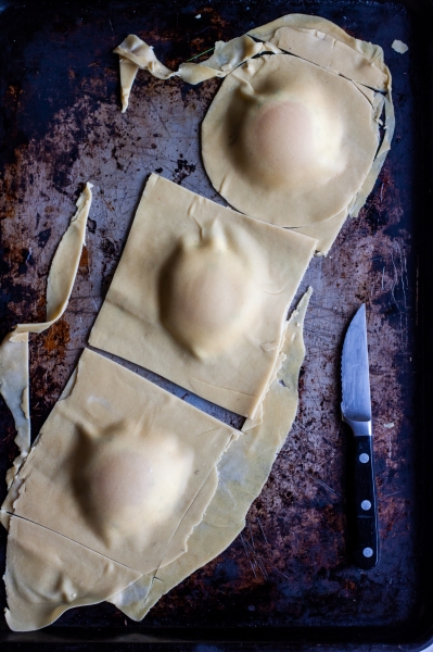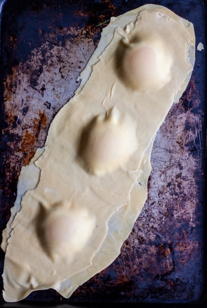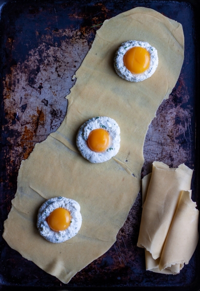 Roll out pasta dough into sheets. Pipe rings of ricotta onto pasta sheets. Transfer egg yolks gently into the center of ricotta rings. Wet pasta dough around ricotta-yolk filling, place another pasta sheet on top of the filling, press around to seal, cut into squares or rounds.