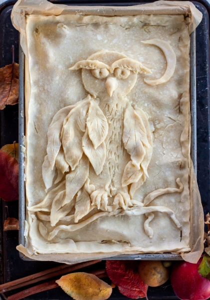 Iš šaldytuvo ištraukti formą su tešla, supilti įdarą. Ant įdaro užkloti antrą tešlos skritulį, užspaudyti kraštelius. Aštriu peiliu įpjauti kelias poros centimetų ilgio skylutes. Pyrago viršų patepti pienu ir pabarstyti cukrumi.