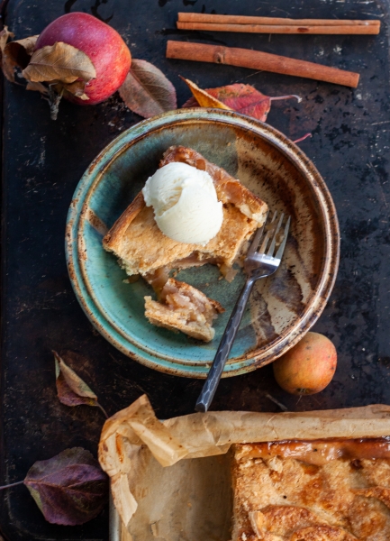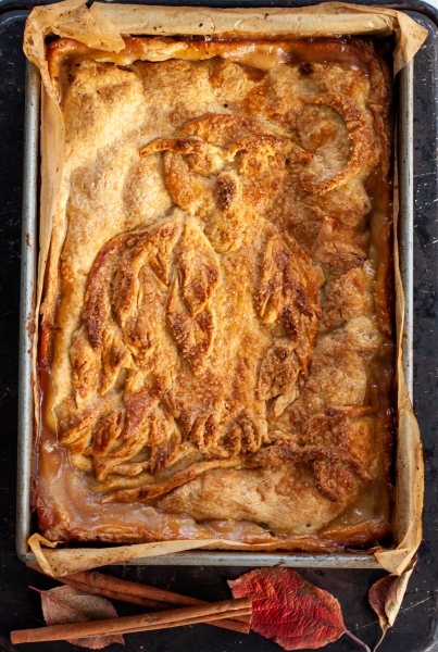 Kepti 45–50 minučių ant apatinės orkaitės lentynos, kol pyrago viršus paruduos, o įdaras pradės burbuliuoti. Pyragą traukti iš orkaitės, dėti ant grotelių, kad atvėstų. Tiekti šiltą arba kambario temperatūros, su plakta grietinėle arba vaniliniais ledais.