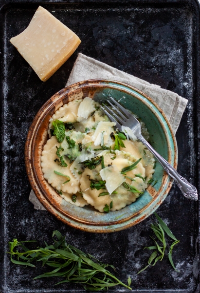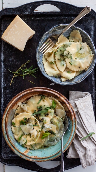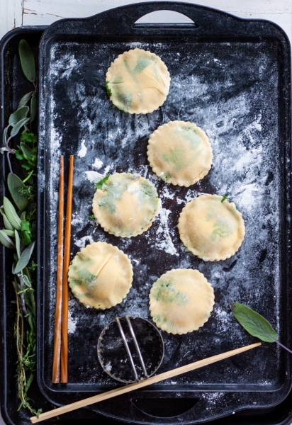 Iš tos gražiosios tešlos aš prispaudžiau apvalių raviolių. Neruošiau jokio įdaro, tik šaukštelis rikotos, užbarsčiau tų pačių žolelių, smulkiai sukapotų. Net druskos į rikotą nedėjau.
