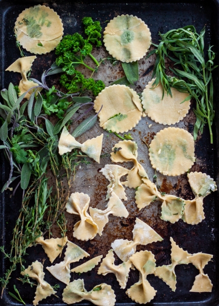 Using a pasta machine, or rolling pin, roll portions of the dough into long thin sheets. Scatter herbs on one of the pasta sheets, cover with another pasta sheet, roll again, to press herbs into dough.
