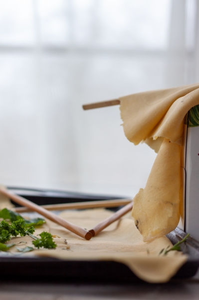 Tešlą dalimis iškočioti į plonus lakštus, ant vieno lakšto išdėlioti žoleles, užkloti antru tešlos lakštu ir vėl iškočioti, kad žolelės įsispaustų į tešlą.