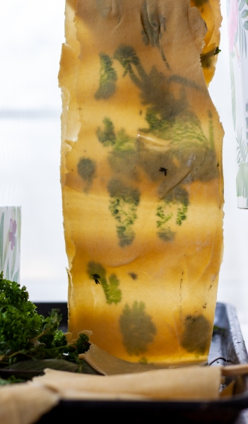 Laminavimas vyksta gana paprastai: tešlą aš pasigaminau virtuviniame kombaine, ilgas makaronų tešlos paklodes išsukau mašinėle (bet laisviausiai galima ir kočėlu iškočioti. Paskui beliko tik išdėlioti žolelių lapelius ir vėl viską persukti per mašinėlę (ar kočėlą), kad lapeliai gražiai įsispaustų į plonai iškočiotą tešlą. Laminavimas baigtas.
